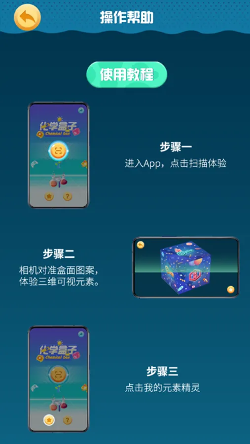 本应用专为在家中或教室中的动手学习,创作和娱乐而设计。家长或教学者可通过元素盒子应用程序实现AR教学、拟人化教学和细节化教学。玩家可通过本应用识别特制的的元素盒子立方体,体验各种化学元素的形态和知识,构建可交互、个性化和可分享的化学元素世界。