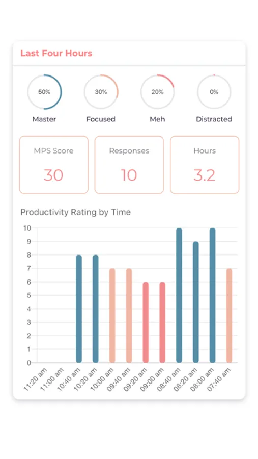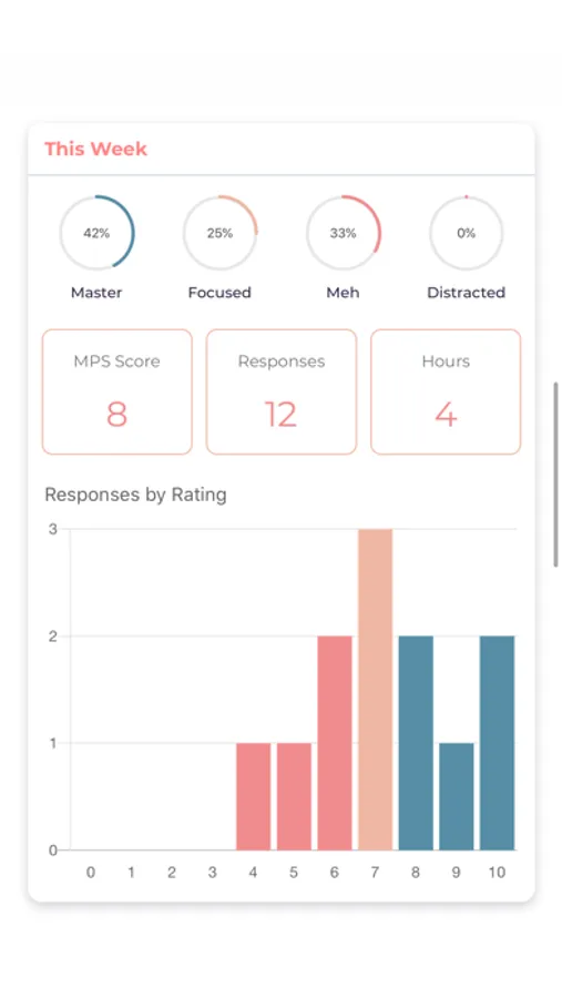 How it Works Fast: The app pings you during your work/school hours. If you are FOCUSED, on task and performing at a professional level then give yourself an 7 or 8 in the app. If the app pings you when you should be working but you are DISTRACTED then give yourself a 0, 1, 2 or 3. When the app pings and you are doing amazing, brilliant work give yourself a 9 or 10 but if you are just doing so-so then rate yourself a 4, 5 or 6.