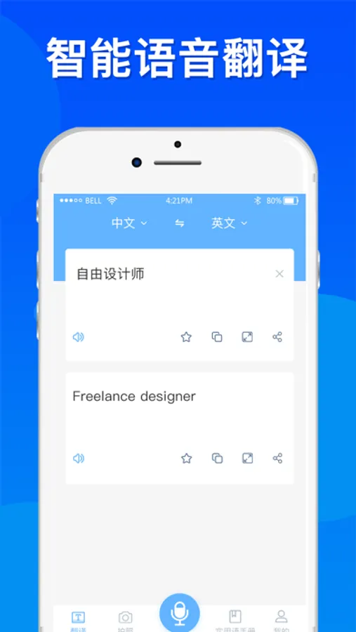 3,语音翻译:强大的语音识别技术,通过AI技术进行语义分析,实时在线翻译。