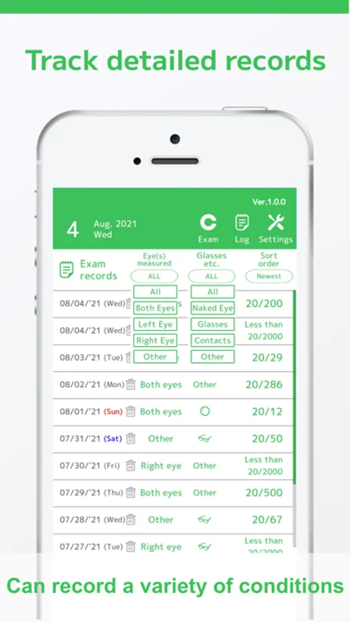 In addition to the date and vision result, other measurement conditions include the eye(s) measured, whether the measurement was taken of your naked eye, and whether or not you were wearing glasses or contacts, allowing for easy review of detailed measurements.