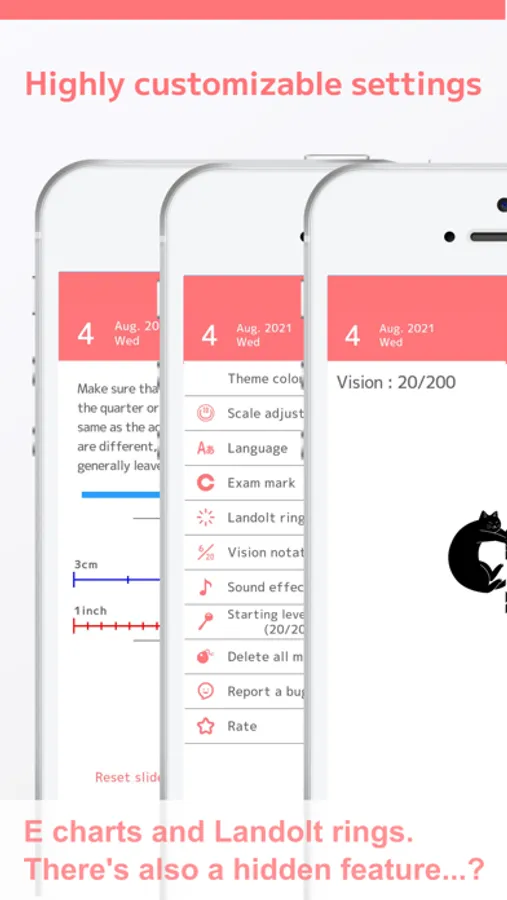 Set the distance between your smartphone and your eyes to display E charts or Landolt rings on your screen in a size according to the distance set.
