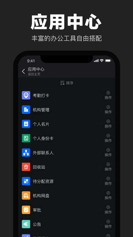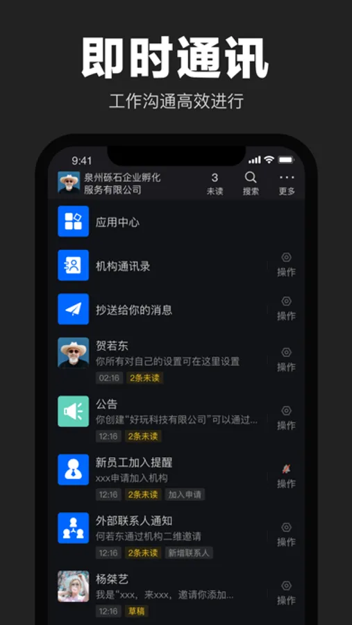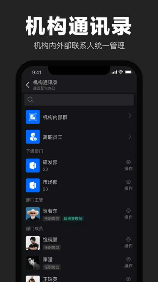 【通讯录】:机构内外部联系人统一管理。用户可设置隐藏模式,其他人不可见;用户可设置限制模式,不可见其他人。