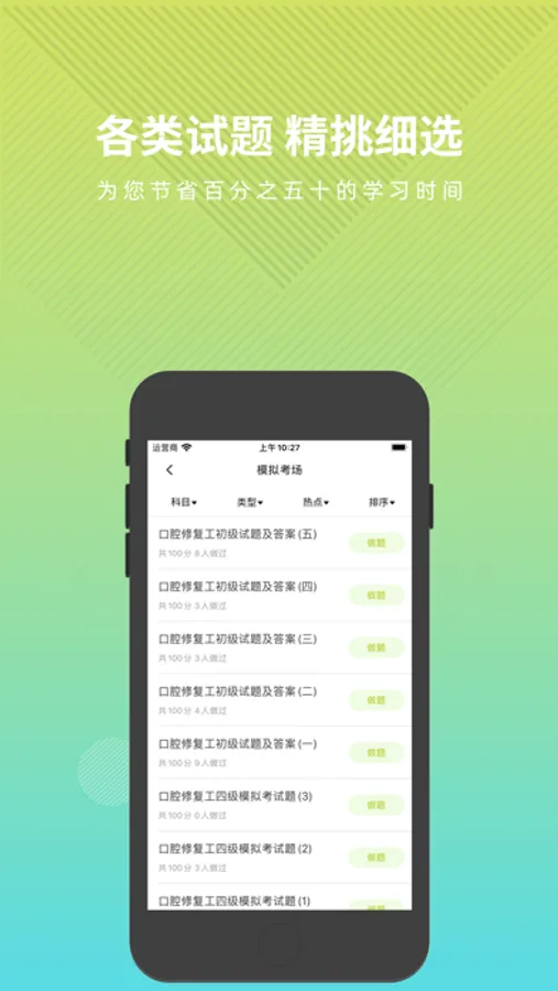 口腔修复体制作工APP有模拟考场、历年真题练习、快速练习、考点练习、做题记录等多种学习与做题模式,丰富多样化的陪你一起考口腔修复体制作工考试。
