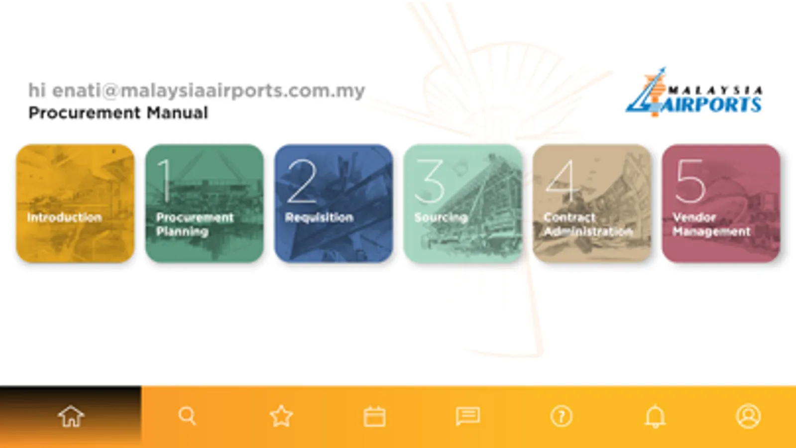 - Enhance the ease and speed of the information and knowledge flow pertaining to the Procurement Manual and latest updates on Malaysia Airports Group Procurement information and activities