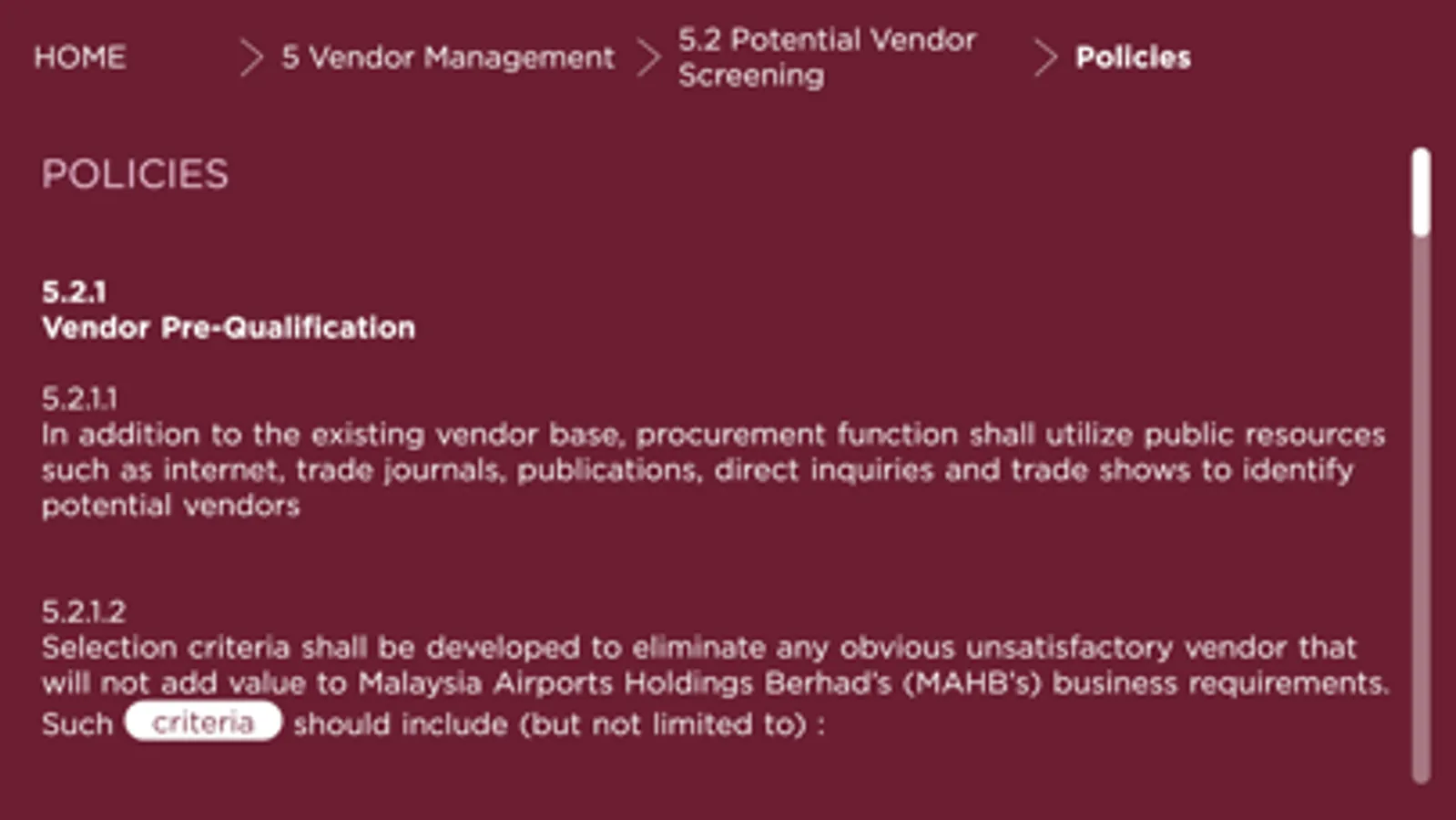 - Enhance user experience when navigating the Procurement Manual to obtain relevant and updated procurement policies and processes and Malaysia Airports procurement information and activities