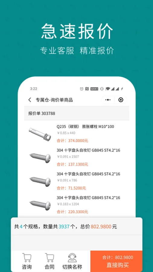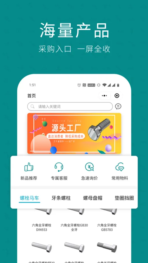 万千紧固件APP主要从询价、发货、收货、退货、对账等几个订单模块,帮助用户优化从线上下单到线下收货过程中的操作流程,使过程更加节省人力、时间成本,使管理更高效。万千客服全程待机,为用户提供询价服务,免去客户线下跑腿的时间,在生成订单后,订单的所有状态、物流信息,全部在APP端清晰呈现,全程追踪,避免疏漏。
