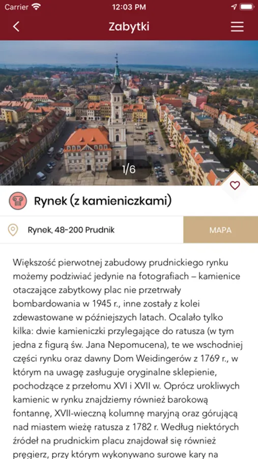 W aplikacji znajdziemy informacje o najważniejszych zabytkach i atrakcjach turystycznych, dowiemy się, gdzie najlepiej aktywnie spędzić czas i wybrać się na spacer z rodziną. Aplikacja ułatwi również znalezienie miejsca parkingowego, restauracji, noclegu i poinformuje o bieżących najciekawszych wydarzeniach w okolicy. Dodatkowo znajdziemy tutaj propozycje różnych wycieczek: pieszych, rowerowych czy nordic walking. Warto szczególnie wybrać się na wycieczkę po oznakowanym szlaku miejskim i posłuchać, co postacie historyczne mogą nam opowiedzieć o najważniejszych atrakcjach Prudnika.