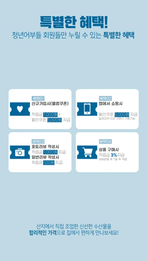 산지에서 직접 조업한 신선한 수산물을 합리적인 가격으로 이제 집에서 편하게 만나보세요!