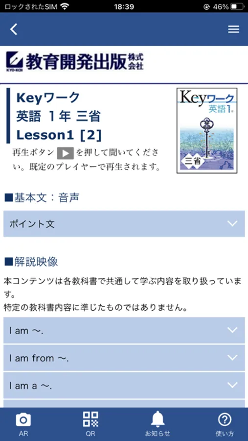 ARマークがあるページ全体にカメラをかざすと、基本文音声や解説映像、参考資料を視聴できます。