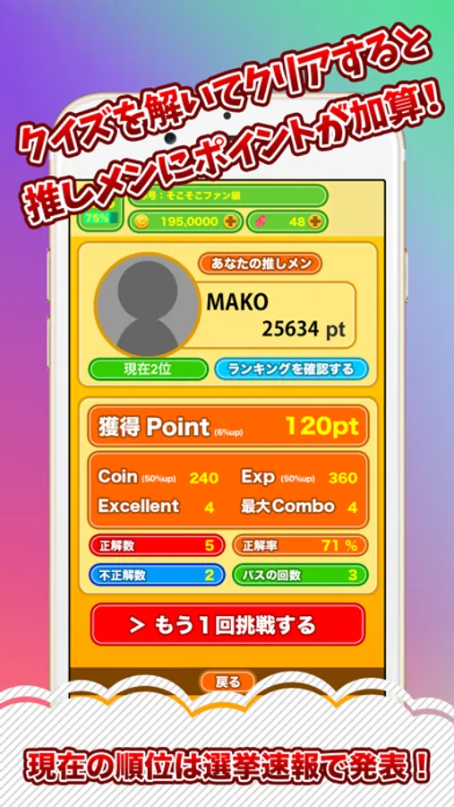 クイズを10問解くと推しメンにポイントが加算されます。(全問正解でポイント2倍!)