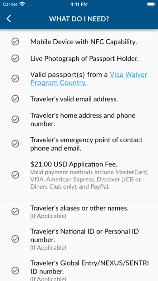 The Electronic System for Travel Authorization (ESTA) app from U.S. Customs and Border Protection allows Nationals of Visa Waiver Program (VWP) countries to apply and pay for a travel authorization without a visa. The ESTA app is a mobile version of the ESTA application process and information that can also be found on the ESTA website at https://esta.cbp.dhs.gov.