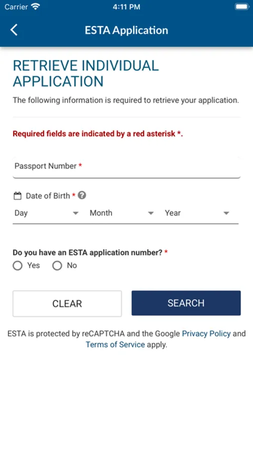 The ESTA app currently has two features available: Apply for New Individual Application and Search for Existing Application.