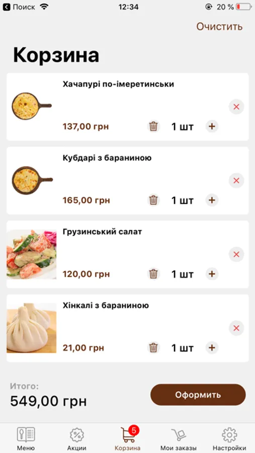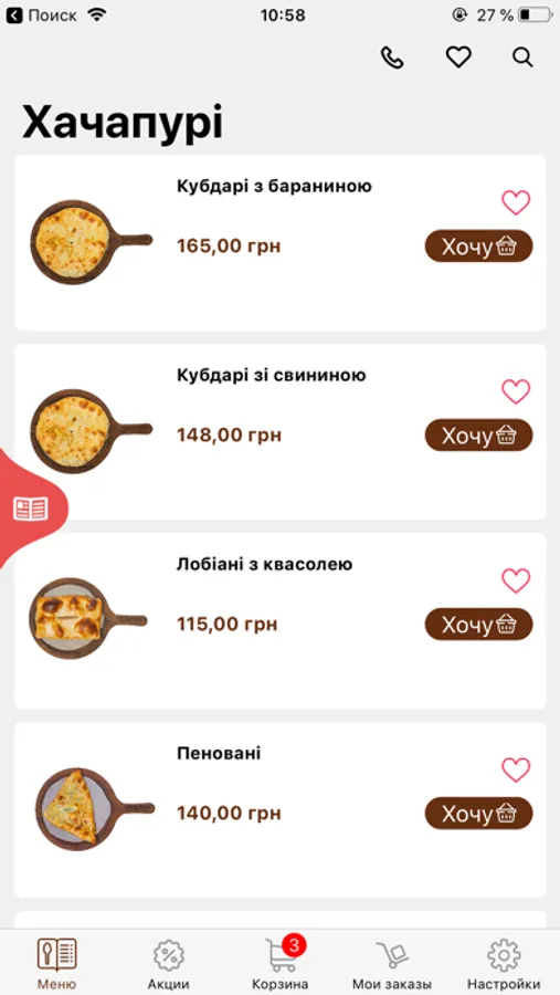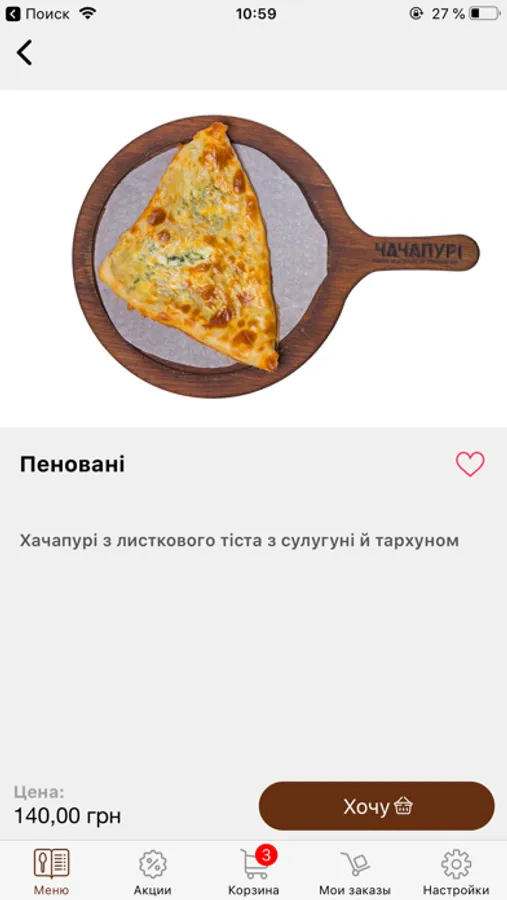 Використовуючи мобільний додаток Чачапурі, Ви з легкістю можете замовити найсмачнішу грузинську їжу на будь-який смак. У нашому меню Ви знайдете хачапурі, хінкалі, чебуреки, салати, десерти і не тільки. Доступні в додатку сортування за ціною, докладні описи і якісні фотографії страв допоможуть Вам вибрати саме те, що Ви хочете.