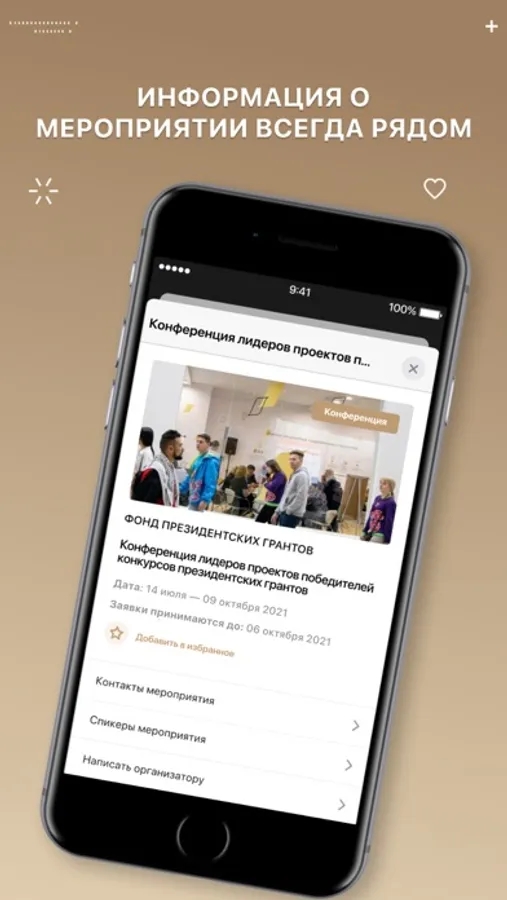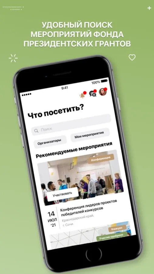 Вы сможете подавать заявки на участие в мероприятиях и общаться с организаторами.
