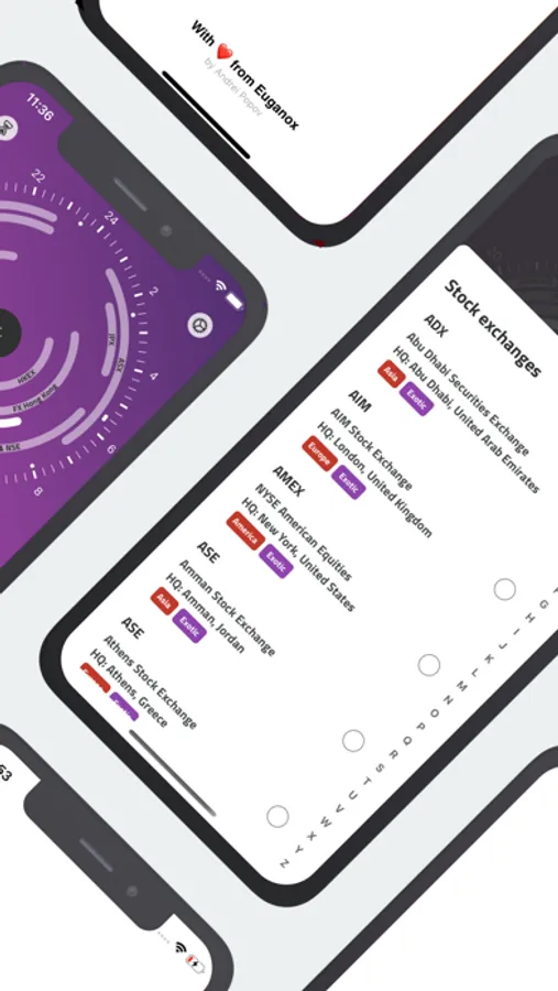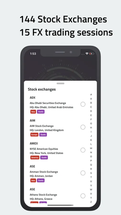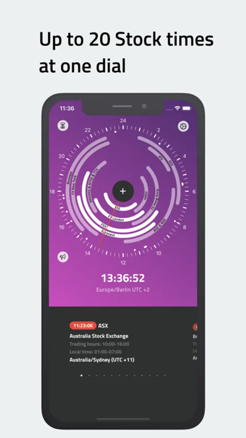 Only with ClockStock 2 you have the choice of 144 Stock Exchanges and 15 Forex trading sessions. You can choose up to 20 Market hours to show on the main dial and change them just in a few taps.