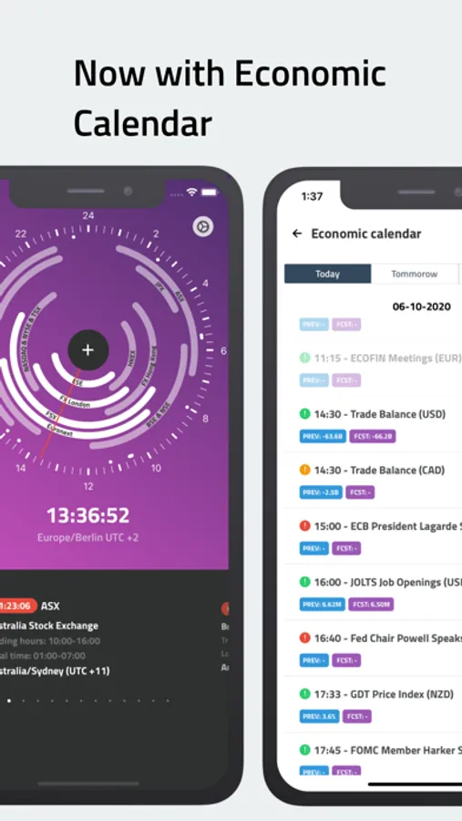 With ClockStock 2 you can easily understand which exchanges are currently open, which are closed and when the other will start their trading day. In addition to this, ClockStock 2 shows a weekly Event (Forex) calendar, all on a single screen.