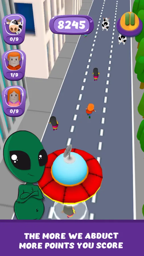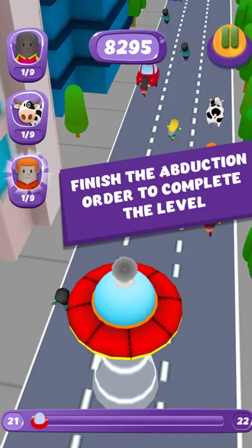 Your duty is to abduct all the living beings requested by the mothership with your spaceship, but be aware to not abduct cars, as they can damage your ship.