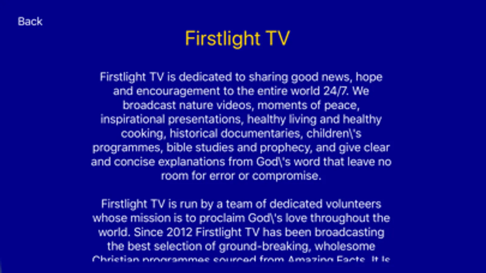 Firstlight TV is dedicated to sharing good news, hope, and encouragement to the entire world 24/7. We broadcast nature videos, moments of peace, inspirational presentations, healthy living and healthy cooking, historical documentaries, children's programs, bible studies and prophecy, and give clear and concise explanations from God's word that leave no room for error or compromise.
