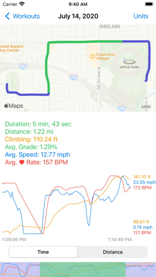 Zoom into segments to see how long it took you climb that hill, or sprint between stoplights. The preview graph at the bottom of the screen, and the map at the top of the screen, help you see where in the workout you're currently looking at.