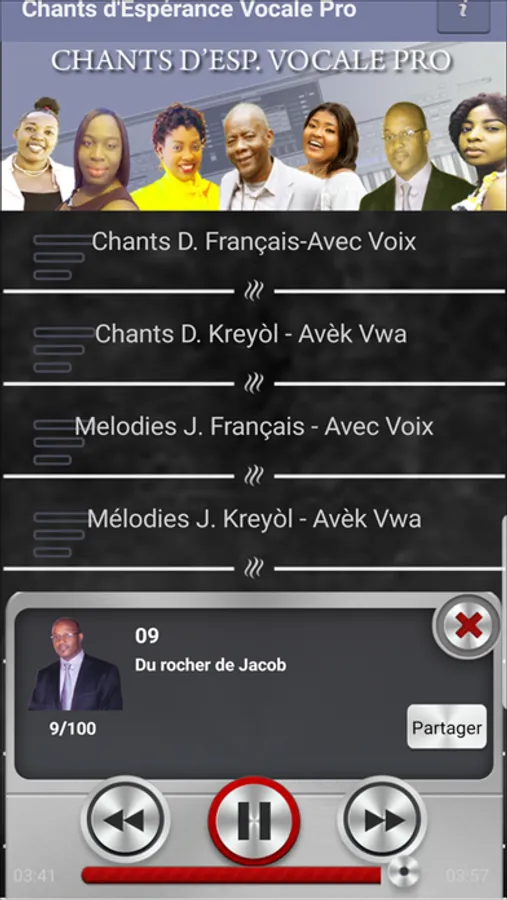 Cette application vous est présentée par l'équipe du projet Chants d'Espérance audio. La version Vocal Pro contient 5 recueils d'hymnes et leurs paroles, qui sont les suivants: Chants d'Espérance Français et Kreyòl, Melodies Joyeuses Francais / Kreyòl et Haiti Chante Avec Radio Lumiere. Nous pouvons maintenant chanter hymnes inconnus en écoutant à la musique jouée. Une fois que le bouton de lecture de la première chanson est enfoncé, l'application jouera automatiquement le reste des hymnes pour vous; facile à utiliser; l'objectif est de vous aider à apprendre toutes les chansons écrites par les compositeurs avec une sauvegarde instrumentale complète pour chaque chanson. Cette application est idéale pour le service de louange et d'adoration, la dévotion personnelle, les mariages, les réceptions de mariage, la marche dans le parc et les occasions spéciales où une atmosphère spirituelle nécessite des instruments spirituels;