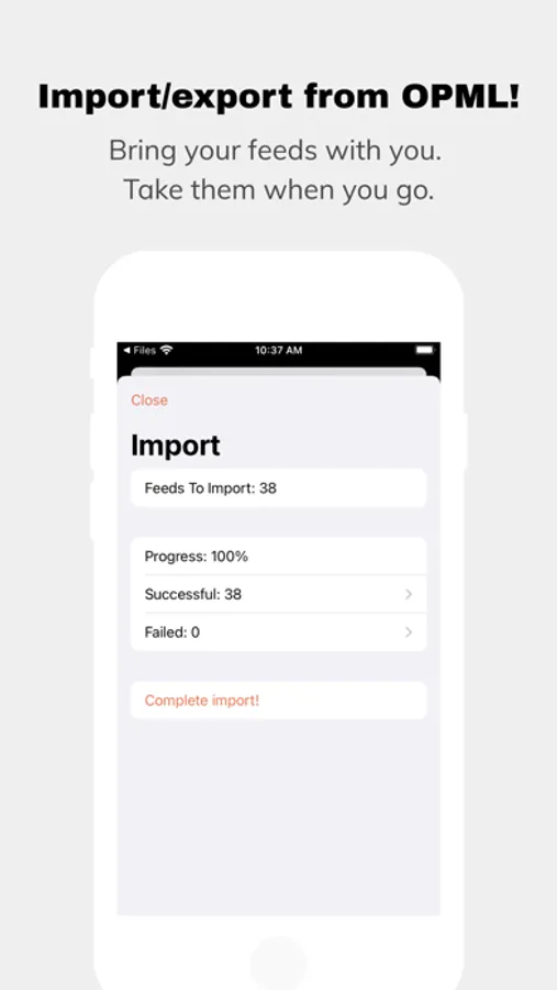 Import your feeds with an OPML file (if you have one from your existing RSS reader). Export your feeds into an OPML file if you hate "An Otter RSS" and want to move to another app. We'll understand. There are plenty of other apps out there and this one might not be the one for you!