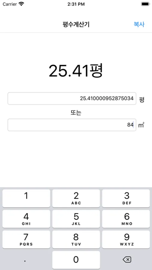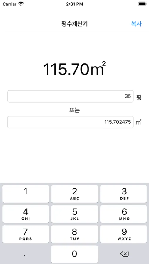 평수와 제곱미터 단위를 간편하게 변환할 수 있습니다.