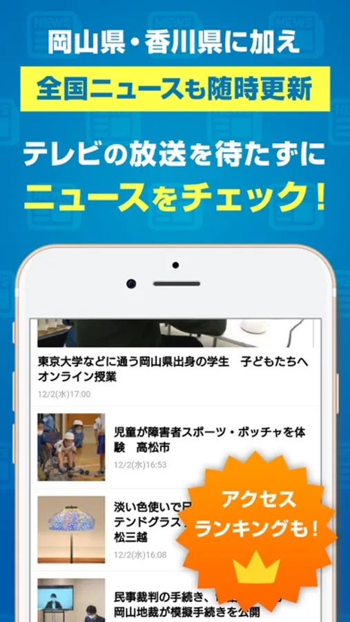 このアプリでは岡山のニュースだけが欲しい利用者には岡山のニュースを、香川のニュースだけが欲しい利用者には香川のニュースを、両県のニュースが見たい利用者には両県および全国のニュースをスマホに表示させることができます。