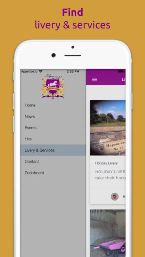 The Hagans Croft Equestrian app provides acces to all our latest, news, events, bookable services and livery services. Receive notifications of Events as they are available, enter Events and check Event startlists and results all within the app.