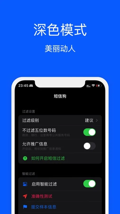 - 为提高短信狗过滤精度,用户可选择主动提交样本,样本数据将仅被用于训练智能模型,不会被分享或用于其他用途;