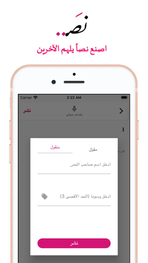 أنشئ حسابك، واحفظ المسودات، وانشر نصوصك عندما تكون جاهزة كتابة وصوتاً. احصل على الدعم والتعليقات من محبي الأدب في جميع أنحاء العالم العربي ورسخ هويتك على الساحة الأدبية.