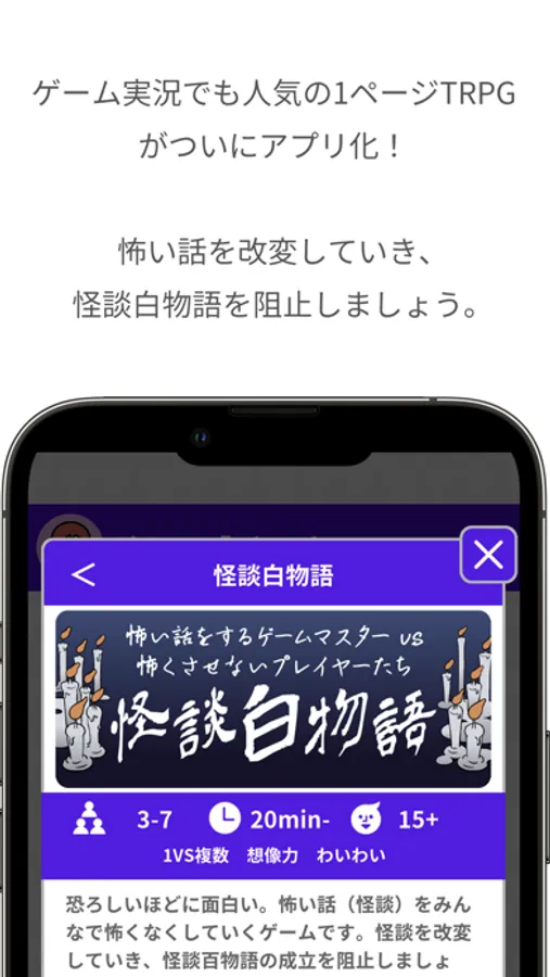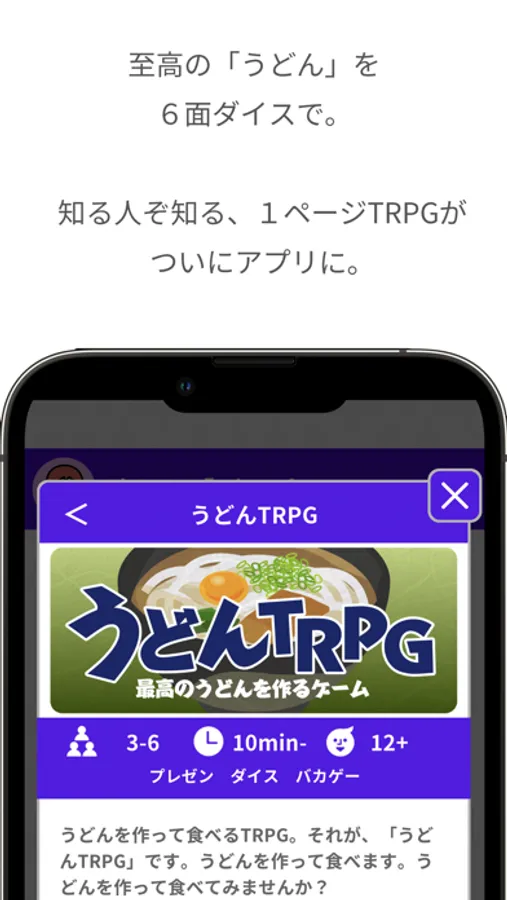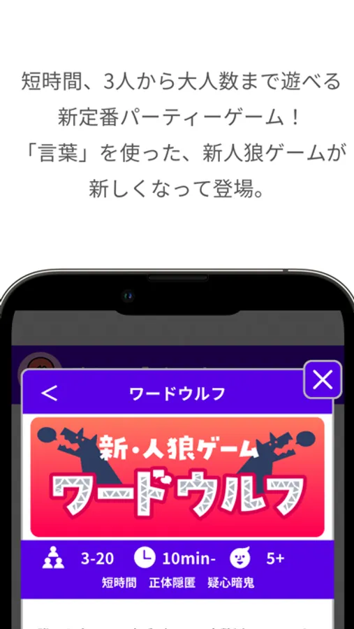 単語を使った新しい人狼ゲーム「ワードウルフ」、アプリ内で水平思考ゲーム「20の扉」、みんなの回答を一致させれば勝利「全員一致ゲーム」、1人の答えを当てに行くクイズゲーム「100の質問」、怖い話を怖くなくする「怪談白物語」、究極の選択パーティーゲーム「マジョリティパーティー」、正体隠匿系知ったかぶりゲーム「全知全能」、伝統的なトークゲーム「NGワードゲーム」、ウミガメのスープ(水平思考ゲーム)のオンライン版「ウミガメオンライン」、うどんを作ってプレゼンする「うどんTRPG」、俳句(川柳)パーティーゲーム「詠み人知らず」、チーム戦連想ゲーム「単語探偵」、山手線ゲームにトラップルールが加わった傑作パーティーゲーム「古今南北」、Hit and Blowやヌメロンなどのような数字当て論理ゲームジャンルの新たなゲーム「マスターナンバー」、じゃんけんを心理戦にする「心理じゃんけん」、くくりトークバラエティ番組TRPG「アレトーーク!」でも遊べます。