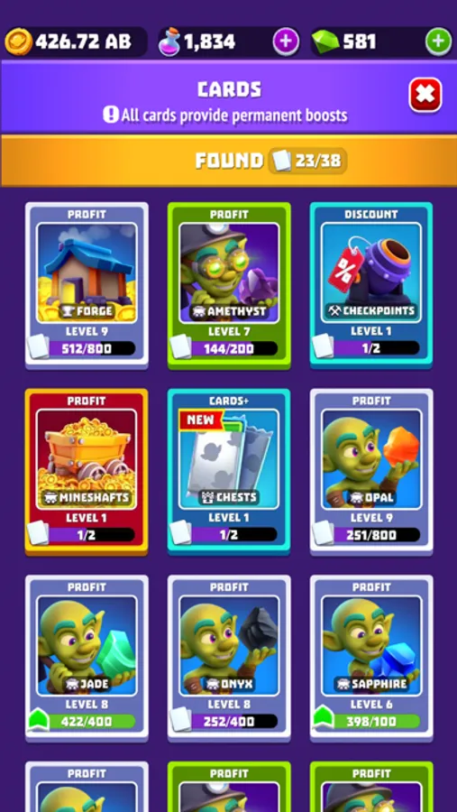 COLLECT cards and upgrade your mine shafts and goblins. There are tons of cards and special abilities to find.