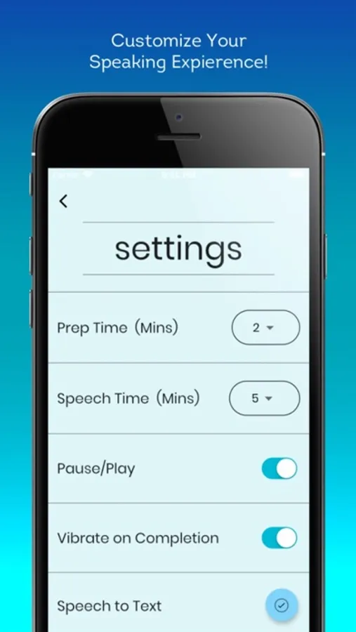 This app to help you prepare for your upcoming speech tournaments for Impromptu! It follows the National Speech and Debate Association (NSDA) format for speaking. While the default times follow the NSDA guidelines, you can customize the times based on your requirements. The app can also now convert your speech to text and analyze the confidence levels in your voice! Happy Speaking!