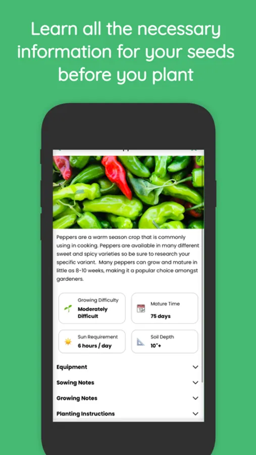 We've done all the research for how to best grow a solid list of plants and we're adding more every release! You can quickly find out how easy a plant is to grow, how long it takes to mature, how to plant and care for and harvest it.