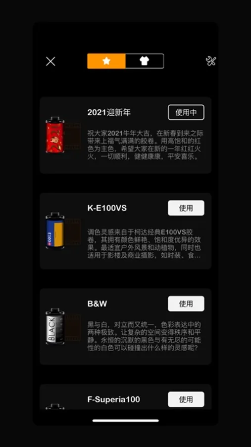 ・目前APP推荐定制多达15款滤镜,未来会持续做更新支持。有糖果色的清新小可爱,怀旧风格的1943,黑白刻印的B&W,科技感反乌托邦的赛博朋克,也有尽力去还原Kodak和FUJI的经典胶卷颗粒,游戏像素风格的PIXEL,以及经典的黑金和青橙。剩下的就不在剧透了,希望你能喜欢。