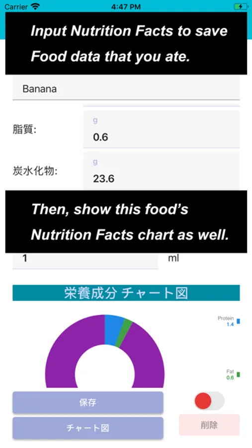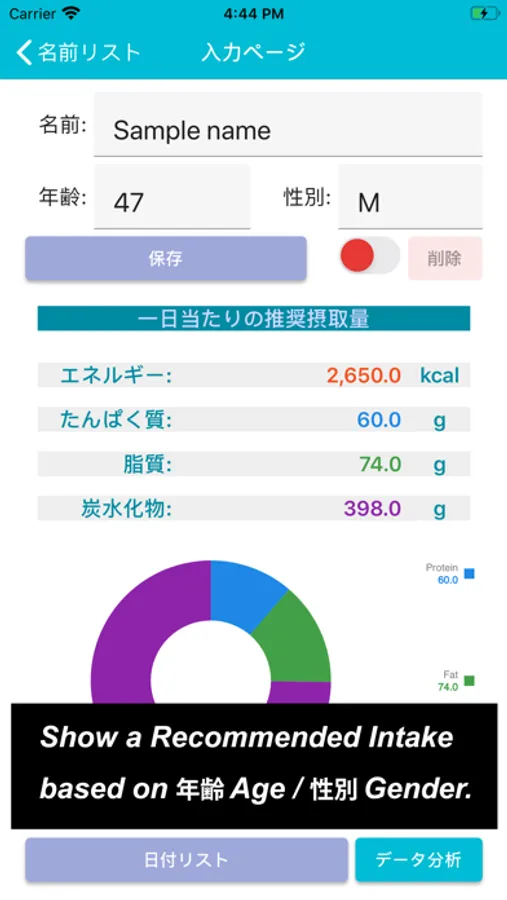 On the one part where you could practice Japanese letters, such as Hiragana / Katakana / Kanji, that used in this app. On the other part where you could make sure your ideal daily Nutrient intake, such as Energy / Protein / Fat / Carbohydrate, by putting your name, age and gender. These information are only saved in your device.