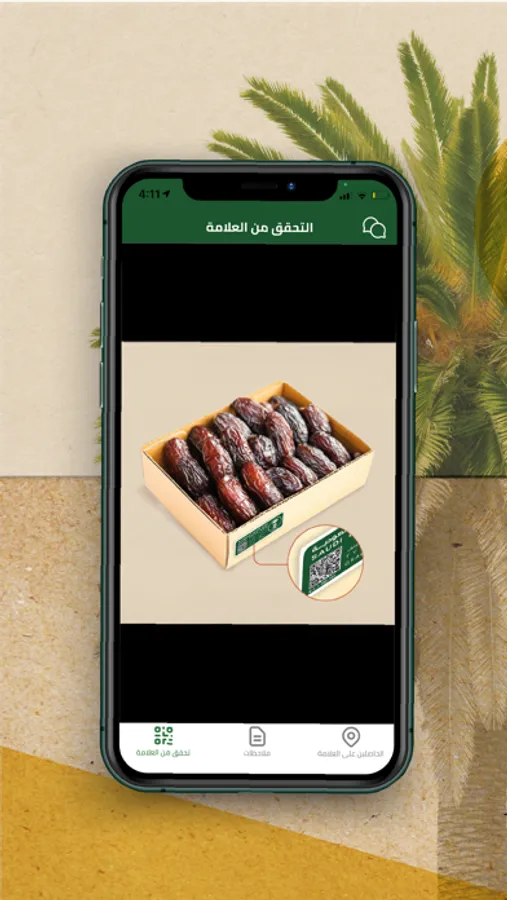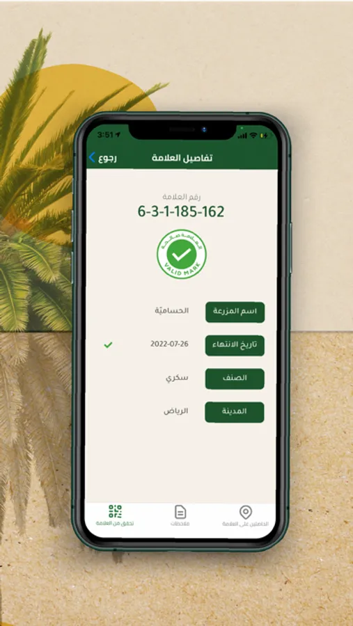 تطبيق علامة التمور السعودية يتيح للمستخدم التحقق من العلامة من خلال استخدام ماسح الرمز الشريطي للتأكد من صلاحية العلامة