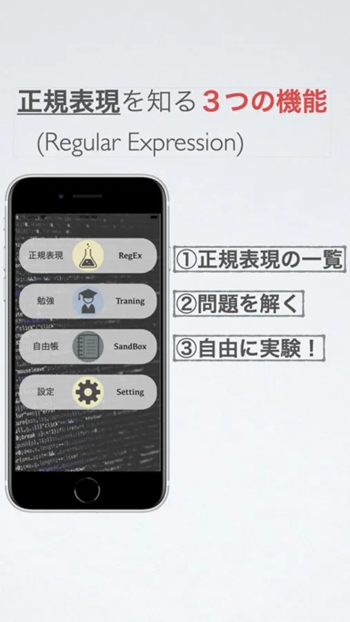 正規表現を覚えるために3つの機能を用意しています。