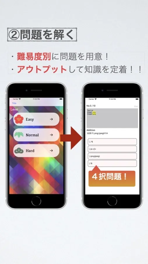 →難易度別に問題を用意しました。4択形式です。