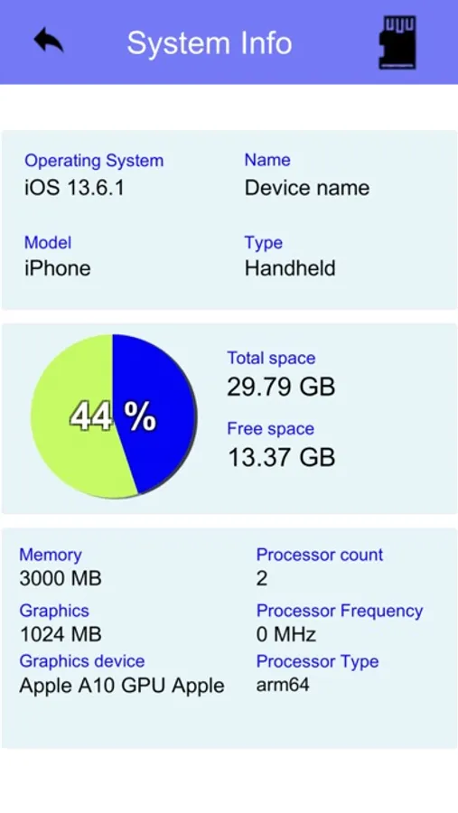 * Displays the internal fixed memory capacity, and the percentage of use. Indicates the name and model of the device.