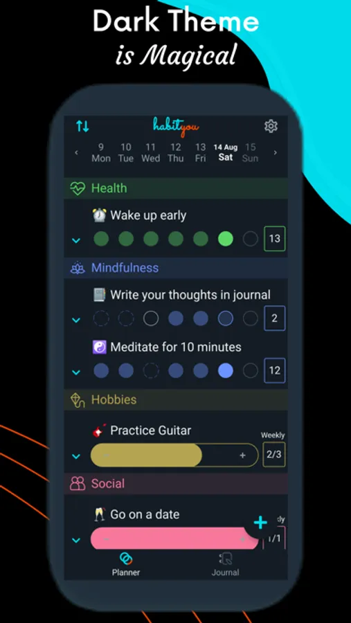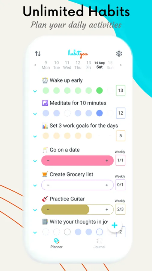 Habit Tracker app by HabitYou. Add unlimited habits for free, set reminders, mark habits, track streaks, earn medals. Your daily journal, bullet points and day planner. Create to-do list for your activity tracker.