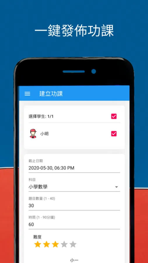 老師可以自由選擇科目、課題、題目數量、時限、難度及提交日期。發佈後學生可於手機、iPad或電腦上隨時開始練習