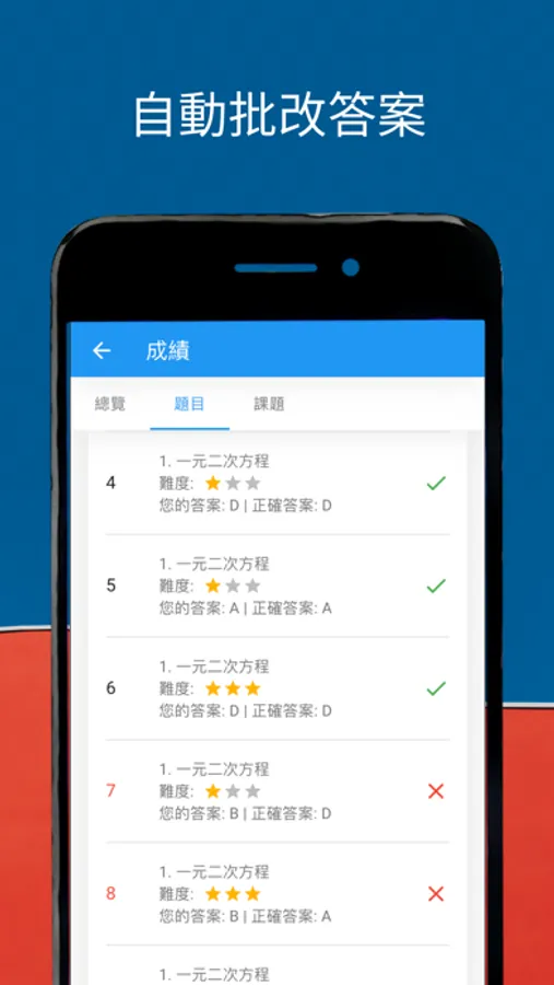 學生完成功課後系統會自動批改答案。老師可以查看成績報告及功課題解