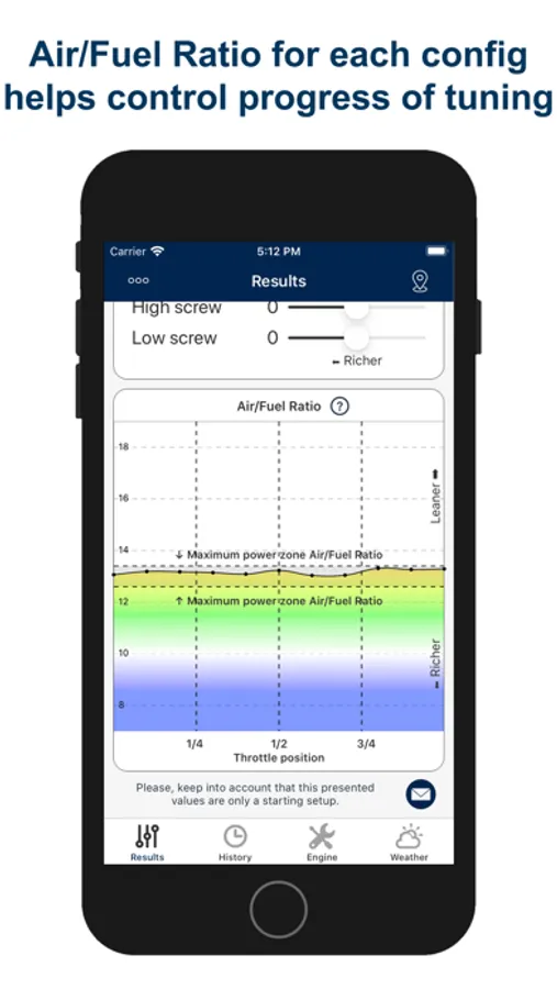 • Results: In this tab high speed screw position, low speed screw position, pop-off pressure, optimal exhaust length, spark plug, spark plug gap, optimal exhaust temperature (EGT), optimal water temperature are shown. These data are calculated depending on the weather conditions and the engine configuration given in the next tabs. This tab lets do a fine tuning adjustment for all this values to adapt to the concrete engine. Also the air density, density altitude, relative air density, SAE - dyno correction factor, station pressure, SAE- relative horsepower, volumetric content of oxygen, oxygen pressure are shown too. On this tab, you can also share your settings with your colleagues. You can also see in a graphic form the calculated ratio of air and fuel (lambda).