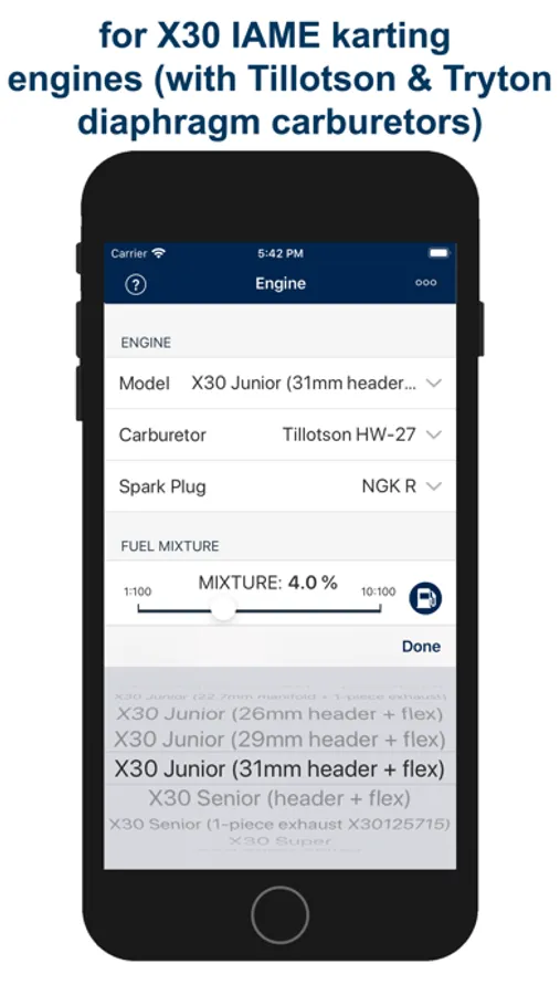 This app provides, using temperature, altitude, humidity, atmospheric pressure and your engine configuration, a recommendation about optimal carburetor config (jetting) for karts with IAME X30, Parilla Leopard, X30 Super 175 engines which use a Tillotson or Tryton diaphragm carburetors