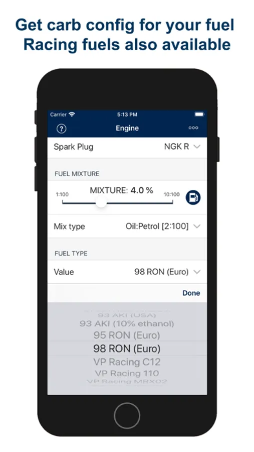 • Mix wizard to get the perfect mix ratio (fuel calculator)