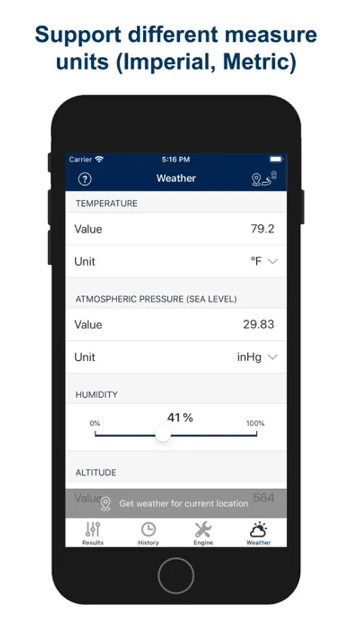 • Weather: In this tab, you can set the values for current temperature, pressure, altitude and humidity. Also this tab allows to use the GPS to get the current position and altitude, and connect to an external service (you can choose one weather data source from several possible) to get the weather conditions of the nearest weather station (temperature, pressure and humidity). In addition, this application can work with a pressure sensor built into the iPhone. Also, on this tab, you can enable alerts about possible carburetor icing.