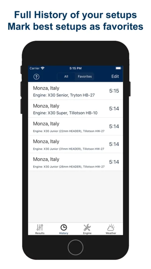 • History: This tab contains the history of all carburetor configs. This tab also contains your favorite carburetor configs.