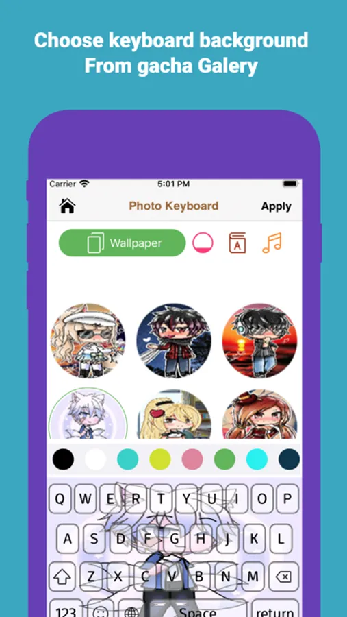 Cute Gacha Keyboard theme is an application that can change the appearance of the keyboard theme to be more kawai with the Gacha theme on your keyboard.There are various kinds of cute and funny character gacha that you can set as the keyboard theme display.How to Use the Kawaii Unicorn Keyboard Theme:* Note: Please install our keyboard first. * Download the Gacha Keyboard Theme from apple store.* Open Gacha life Keyboard Theme and click the ACTIVATE THEME button. * Cick add button to open new keyboard.* Choose background picture from gallery* Choose a keys form and color.* Choose a keys font.* Choose a keys sounds * Click apply button.Featured Themes keyboard* Gacha keyboard Theme Center offers all categories of stylish themes. * Customize keyboard theme by choosing your own photos, HD wallpapers, Gacha life HD wallpapers,. You can also change the theme colors, customize the font styles, fonts sizes and colors! You can be a designer to create your own theme. Share with your friends so that the gacha fans feel happy with the presence of this keyboard theme application.