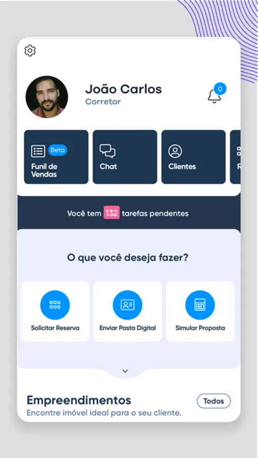 Faça todo o processo de vendas pelo aplicativo, envio de propostas, reserva de unidades, gestão de atendimentos. Através do funil de vendas é possível visualizar e organizar todos os negócios em andamento em cada etapa da venda.